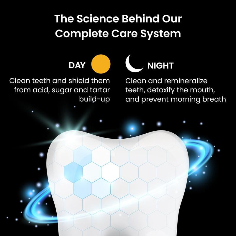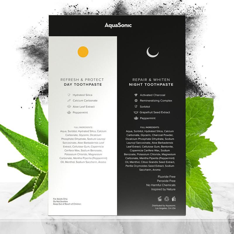 Day Toothpaste: Banish morning breath, kickstart all-day freshness, and shield teeth from tartar buildup, sugar and acid for up to 12 hours. Superior anti-cavity formula features hydrated silica, calcium carbonate, aloe leaf extract, and peppermint. Start your day off on the right foot with Refresh & Protect premium high-quality toothpaste. Night Toothpaste: Eliminate plaque and debris, strengthen teeth, and polish away stains to whiten up to 10 shades. This detoxifying formula features activated charcoal, remineralizing complex, grapefruit seed extract and peppermint. Before you go to sleep, end your day with the power of Repair & Whiten toothpaste for complete peace-of-mind knowing you'll wake up with a healthier mouth and gums. Includes one 2.3oz tube of Refresh & Protect Day Toothpaste and one 2.3oz Repair & Whiten Night Toothpaste.